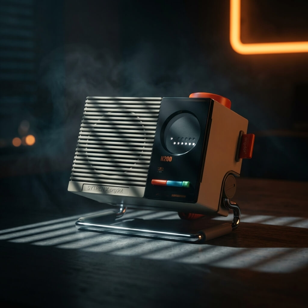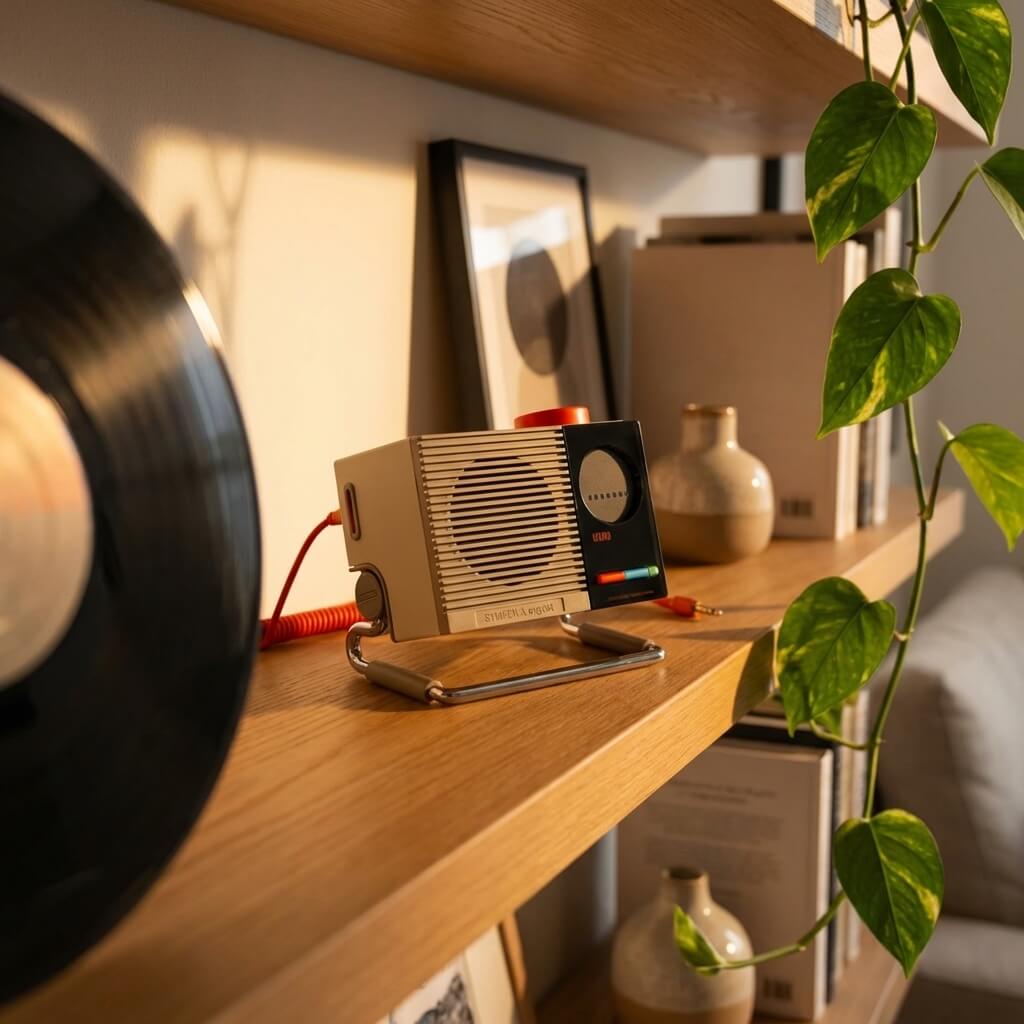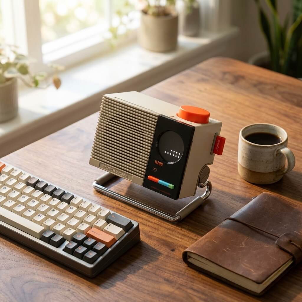 Meet the ultimate fusion of mid-century industrial charm and modern acoustic engineering. This retro-futuristic desktop Bluetooth speaker is designed for those who appreciate both high-fidelity sound and impeccable interior styling. Whether you are curating the perfect workspace or looking for a statement piece for your living room, its distinct louvered grille and cream-and-chrome palette instantly upgrade your environment.