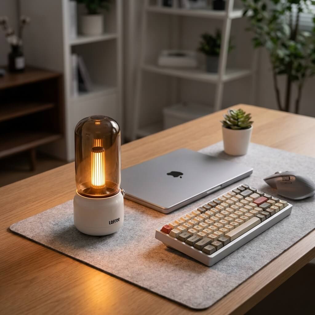 Transform your desk setup or nightstand with this retro-modern ambient LED lamp. Featuring a vintage-style glowing filament and a smoky tinted dome, it perfectly mimics the calming glow of candlelight. The tactile metallic knob and matte white base make it a premium addition to any cozy, aesthetic workspace.