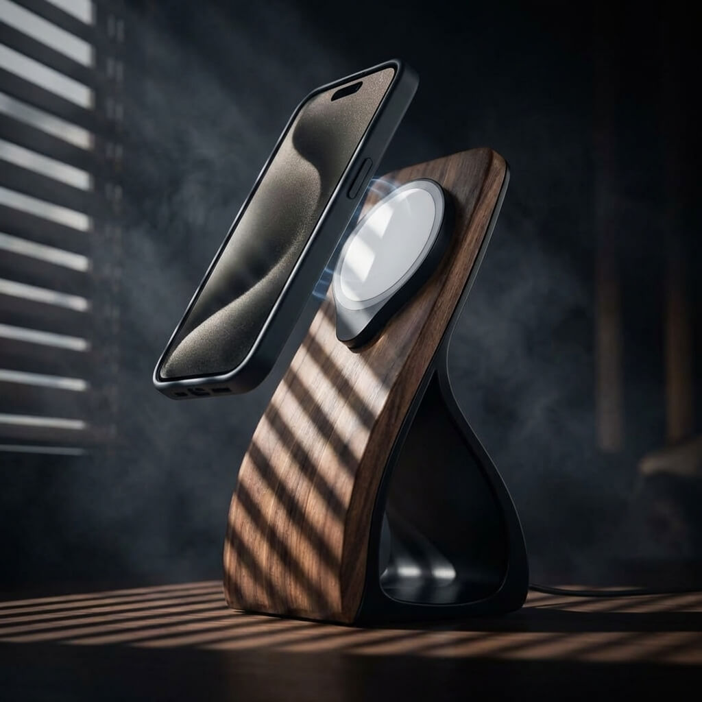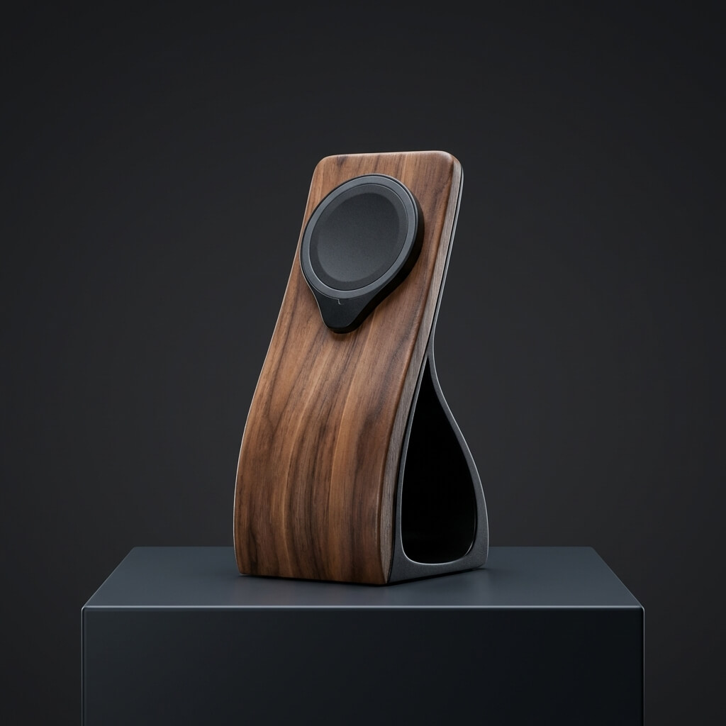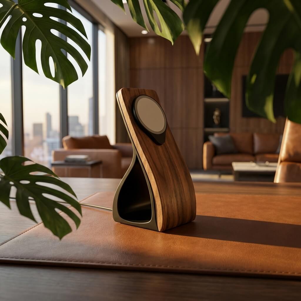 Elevate your workspace with this Sculptural MagSafe Charging Stand. Blending warm mid-century modern aesthetics with cutting-edge functionality, this premium charging mount is the ultimate desk accessory for the design-conscious professional.