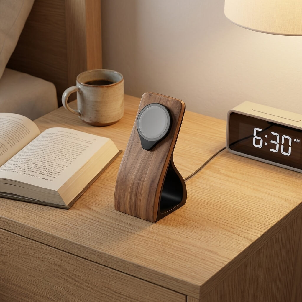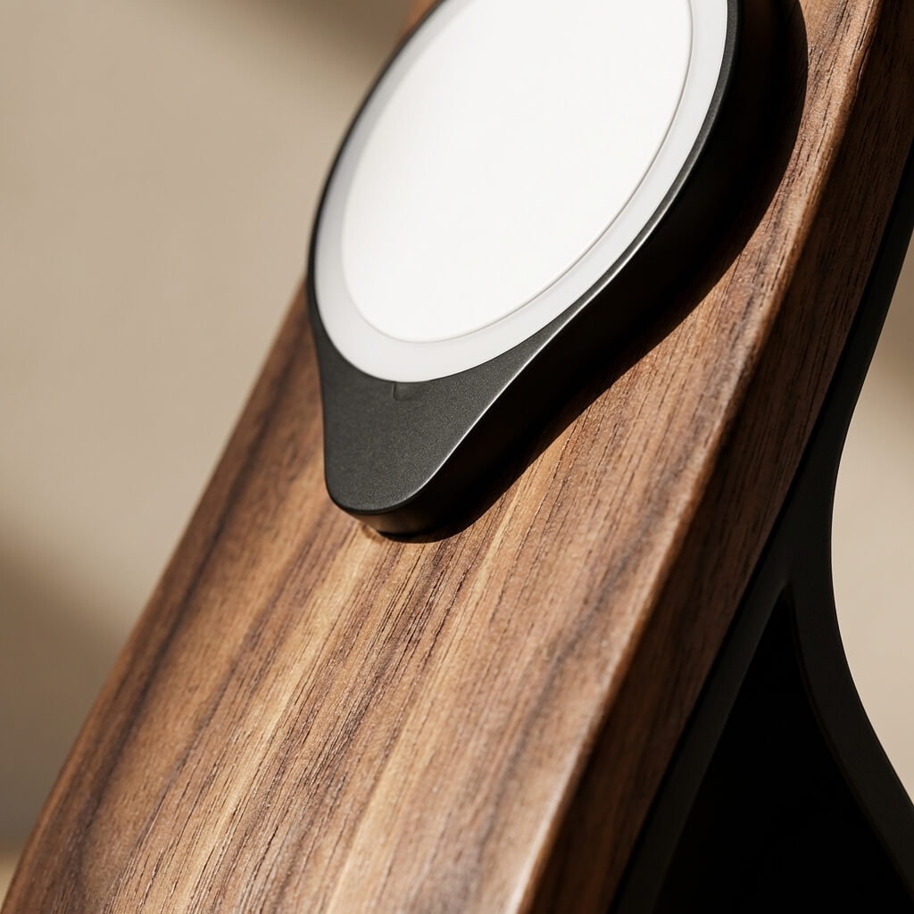 Upgrade your desk setup with a sculptural MagSafe charging stand that doubles as modern art. Crafted with a premium walnut finish and a sleek matte black frame, it effortlessly blends mid-century warmth with modern tech. Enjoy ergonomic viewing angles perfect for video calls and StandBy mode. The ultimate aesthetic gift for the organized professional.