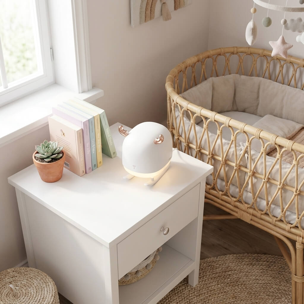 - Multifunctional design combining a soothing night light and a mini air humidifier.