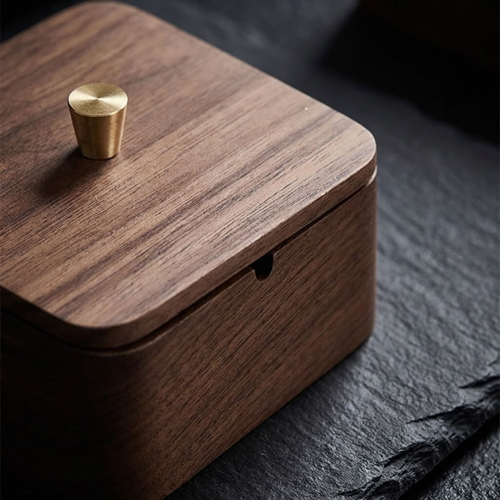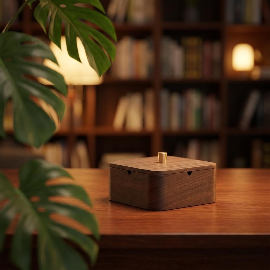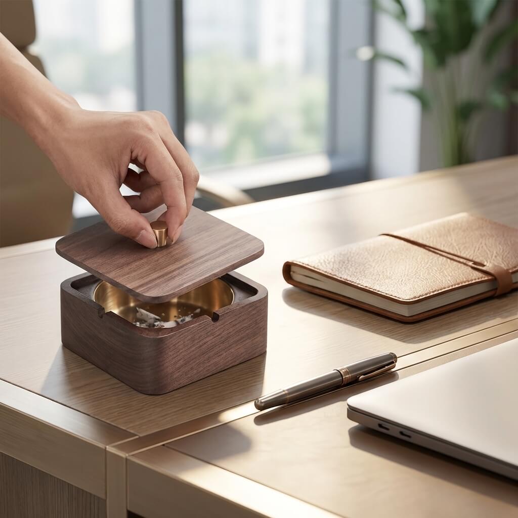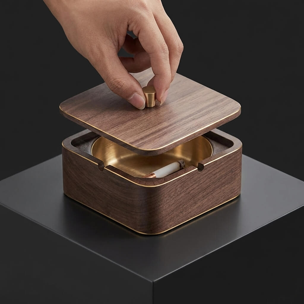 Upgrade your lounge or office with this mid-century modern lidded ashtray. Crafted from premium dark wood with striking brass accents, it effortlessly conceals ash and traps lingering odors. It serves as the ultimate sophisticated gift for design-conscious cigar and cigarette aficionados.